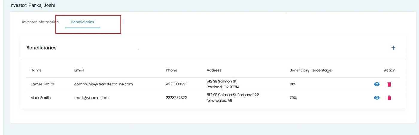 The Tab: Beneficiaries tab allows you to view and manage all beneficiaries associated with an investor.