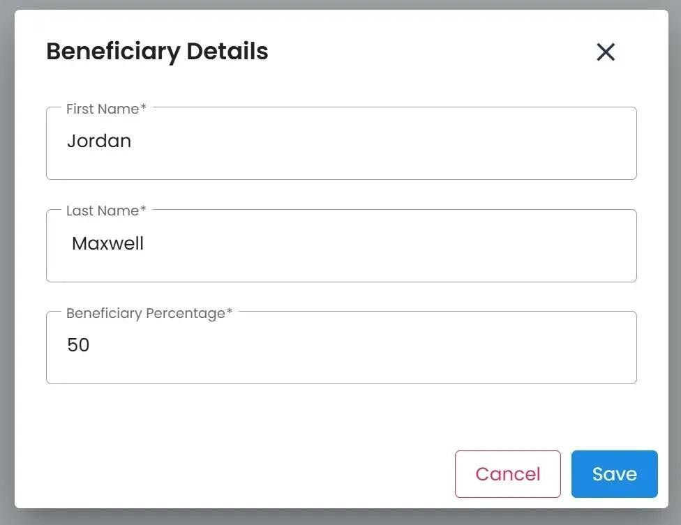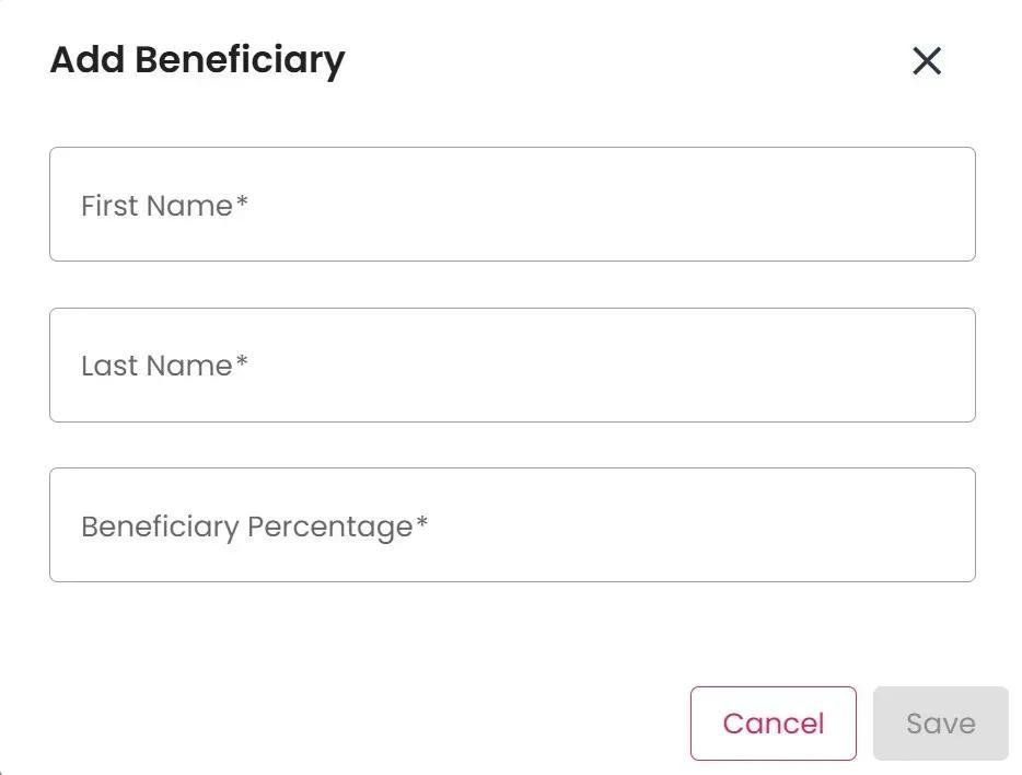 Enter the beneficiary’s First Name, Last Name and Beneficiary Percentage into their respective input fields.