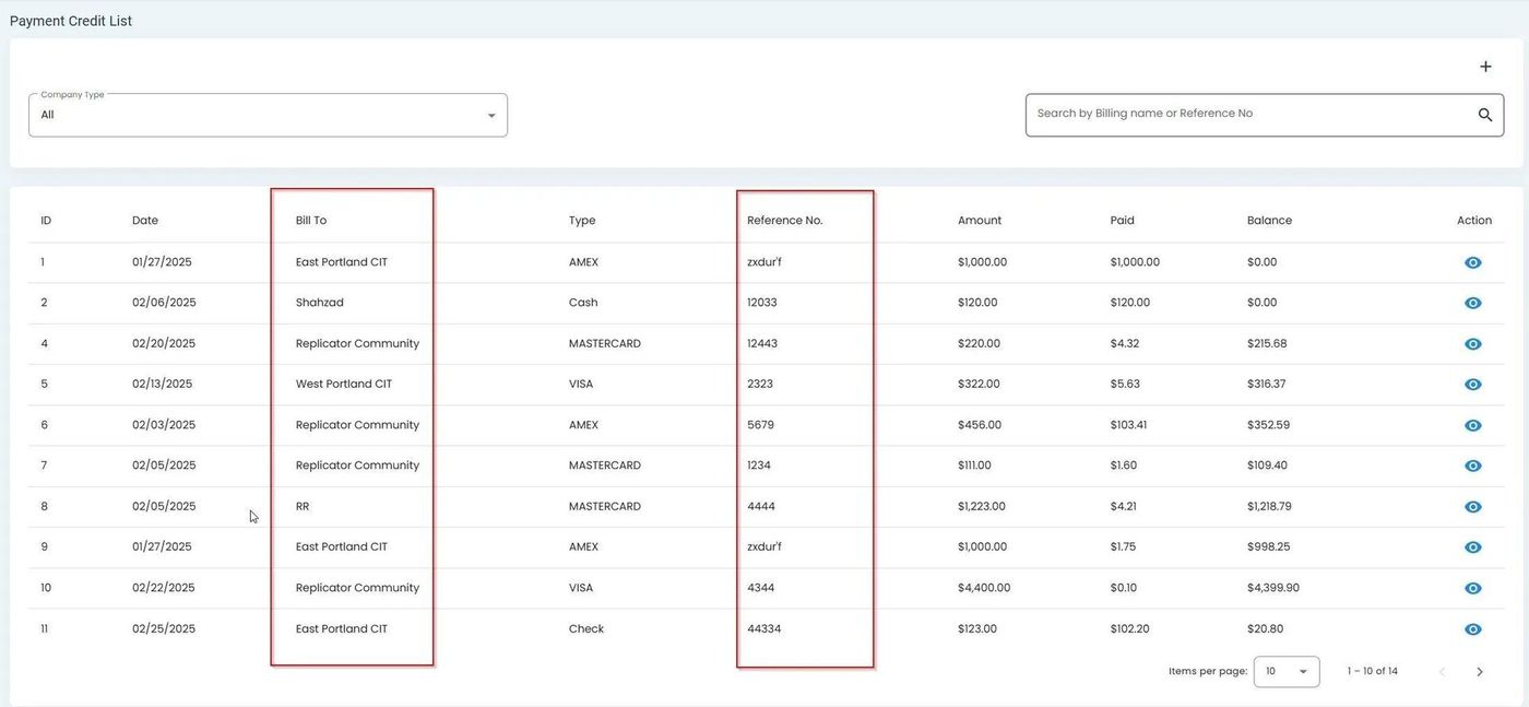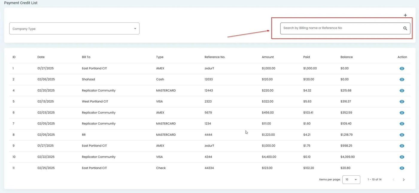 You can search for specific payment records using the search functionality.