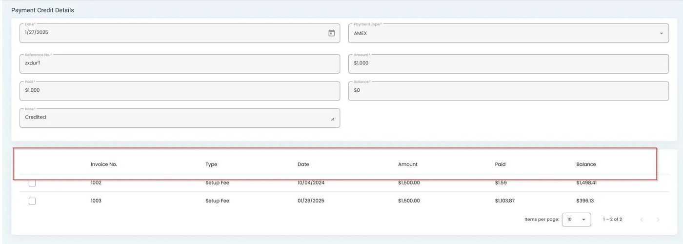 Columns of information in the Payment Details screen#