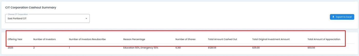 Dashboard, CIT Corporation Cashout Table Columns Explained#
