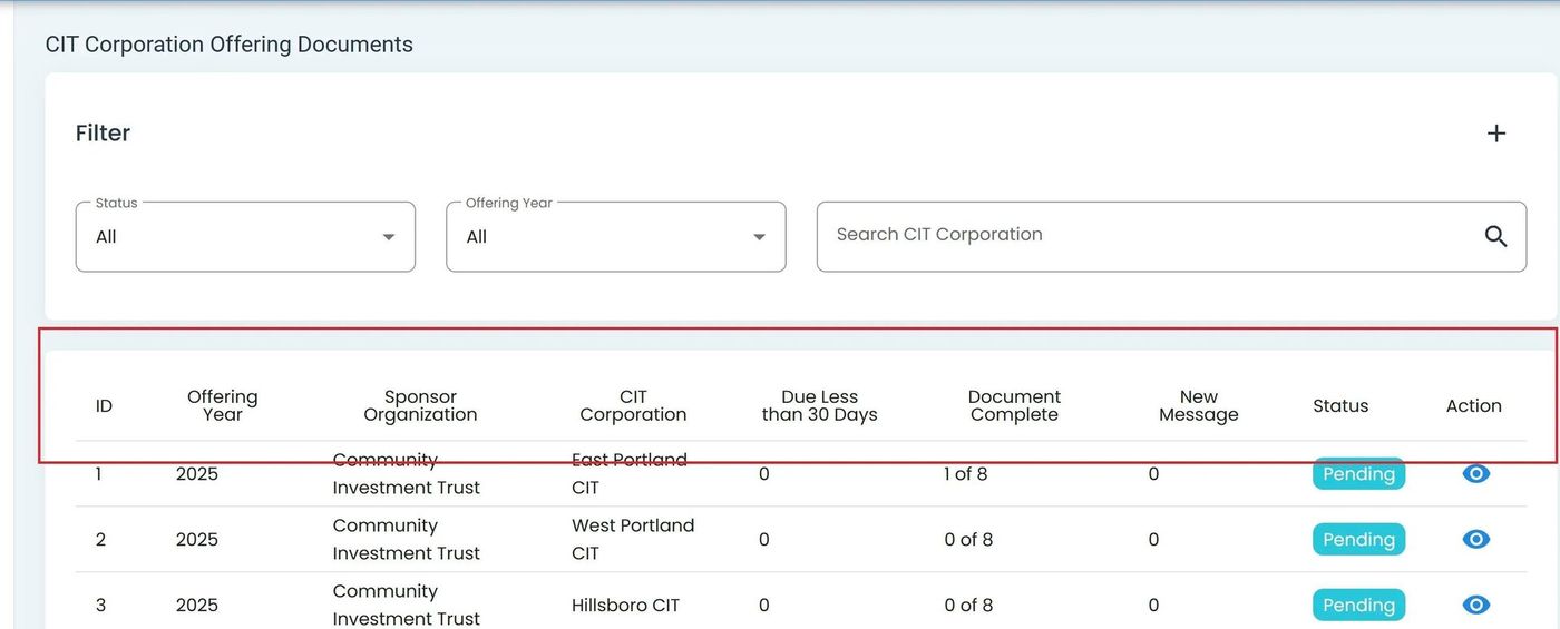 Action: View More Details: Action to view more details about the documents and where they are at on the offering process for the selected CIT Corporation.