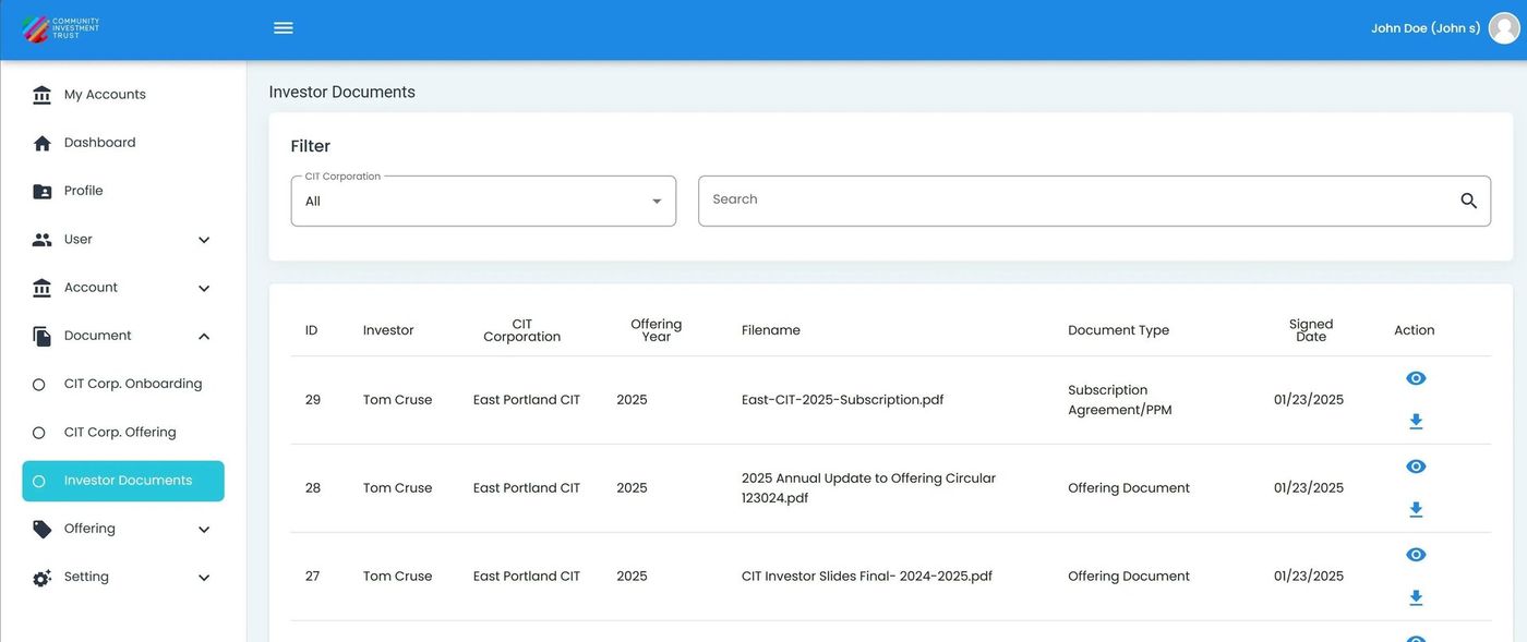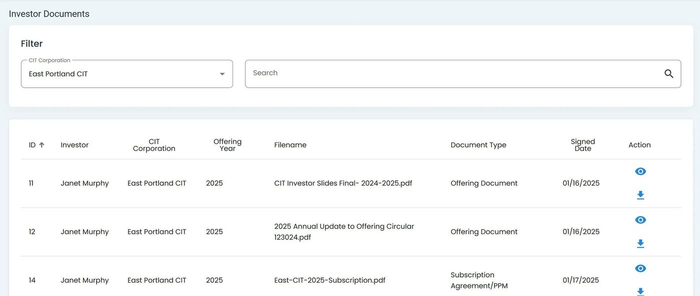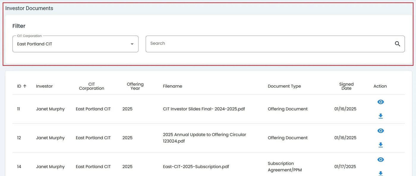 The Investor Documents Table is the primary interface for accessing investor-related files: