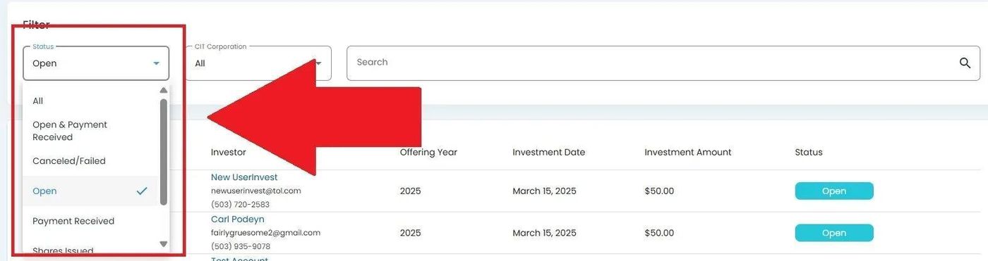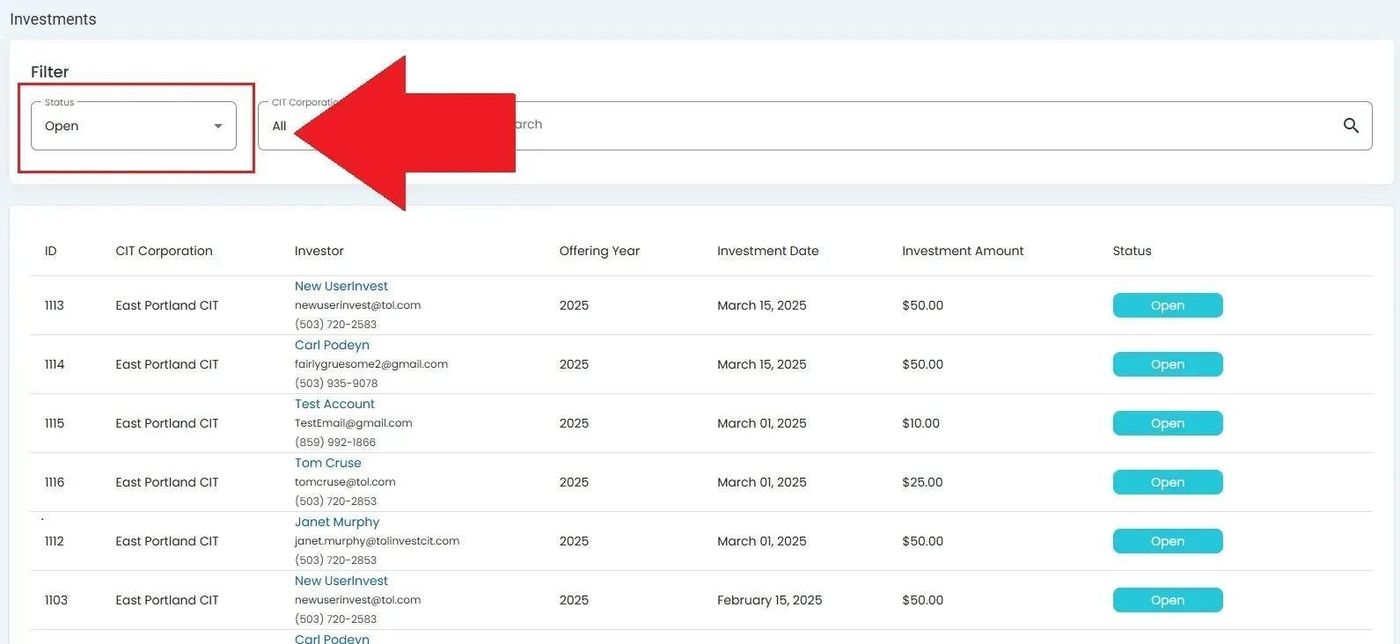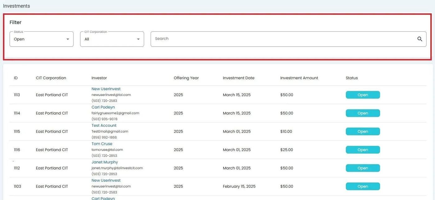 The filter section at the top of the table allows you to search and filter investments by various criteria.