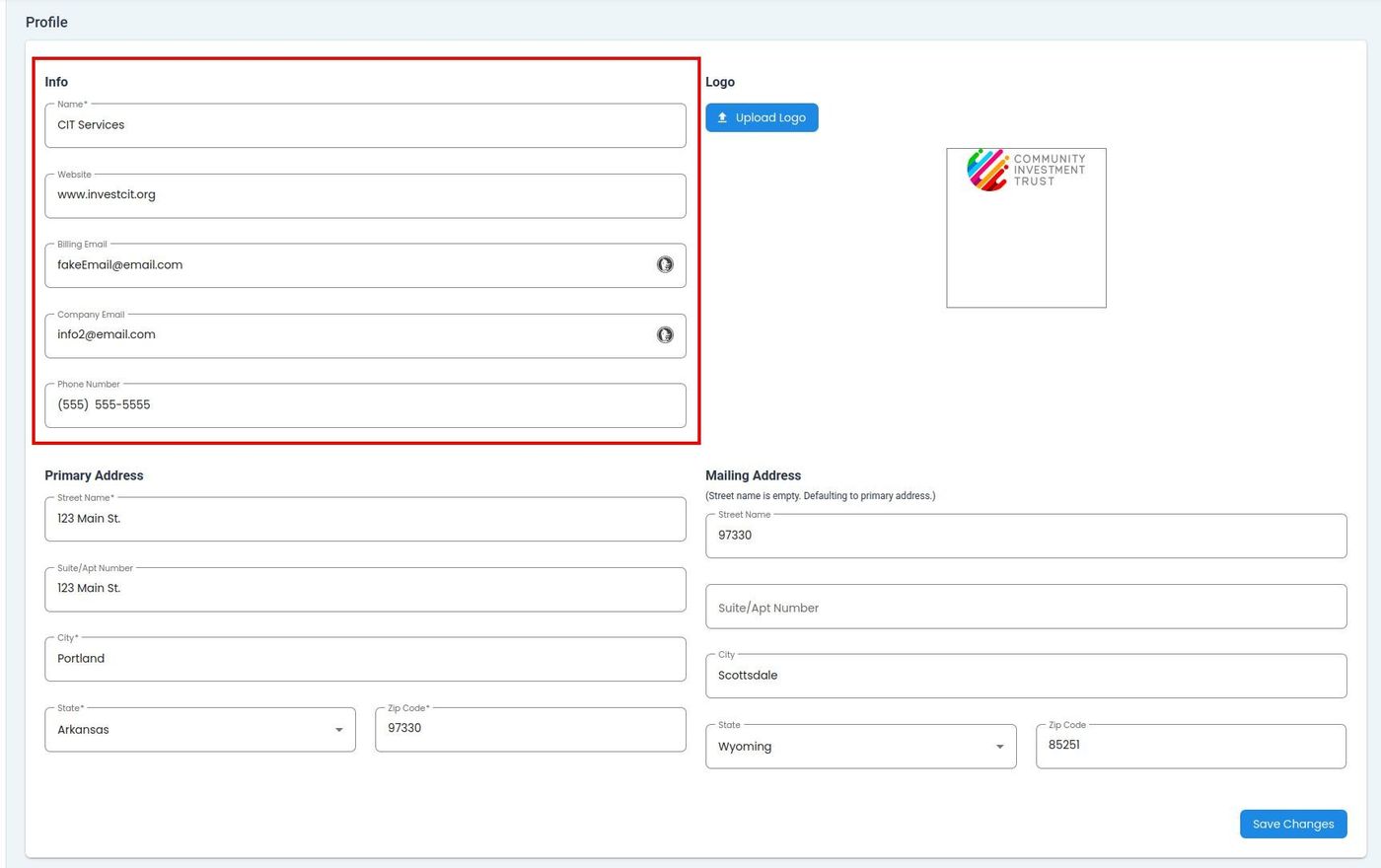 The Section: Name and Contact Information section allows you to modify company details related to legal name and contact information.