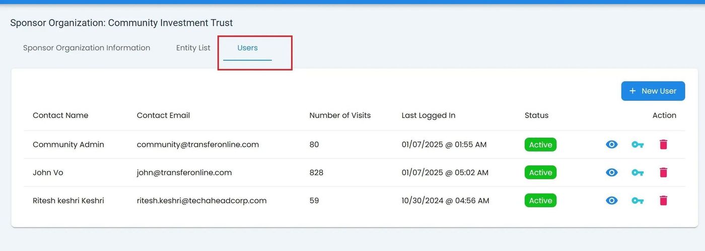 The Tab: Users tab provides a comprehensive list of all users associated with the Page: Sponsorship Organization.