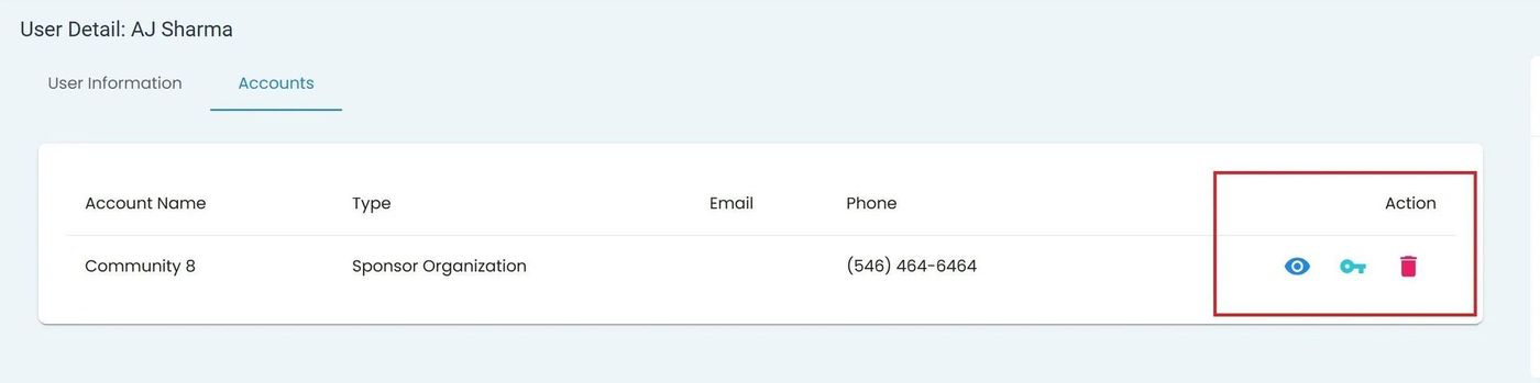 User, User Details Homepage, Tab: Accounts Tab, Section: Action Column#