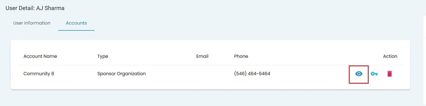 User, User Details Homepage, Accounts Tab, View Account Icon#