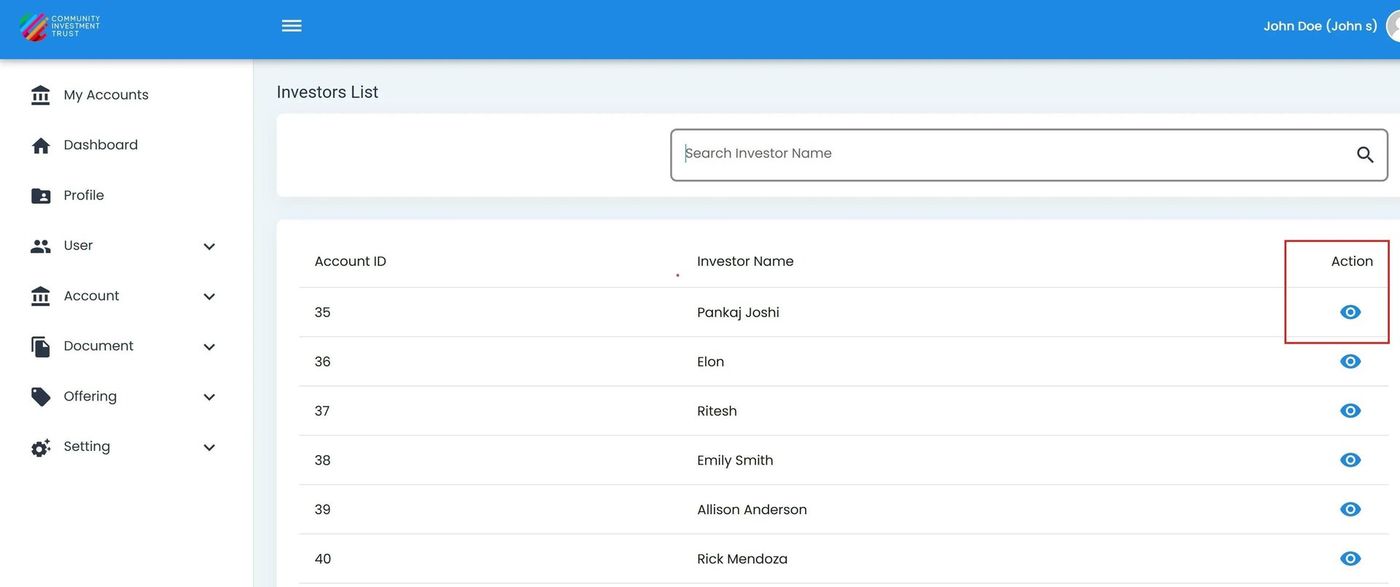 2. Click the View Investor Details icon located in the Column: Action column for that investor.