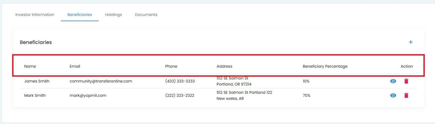 The Tab: Beneficiaries tab allows you to view and manage all beneficiaries associated with an investor.