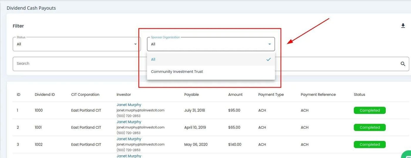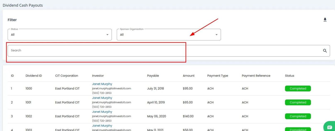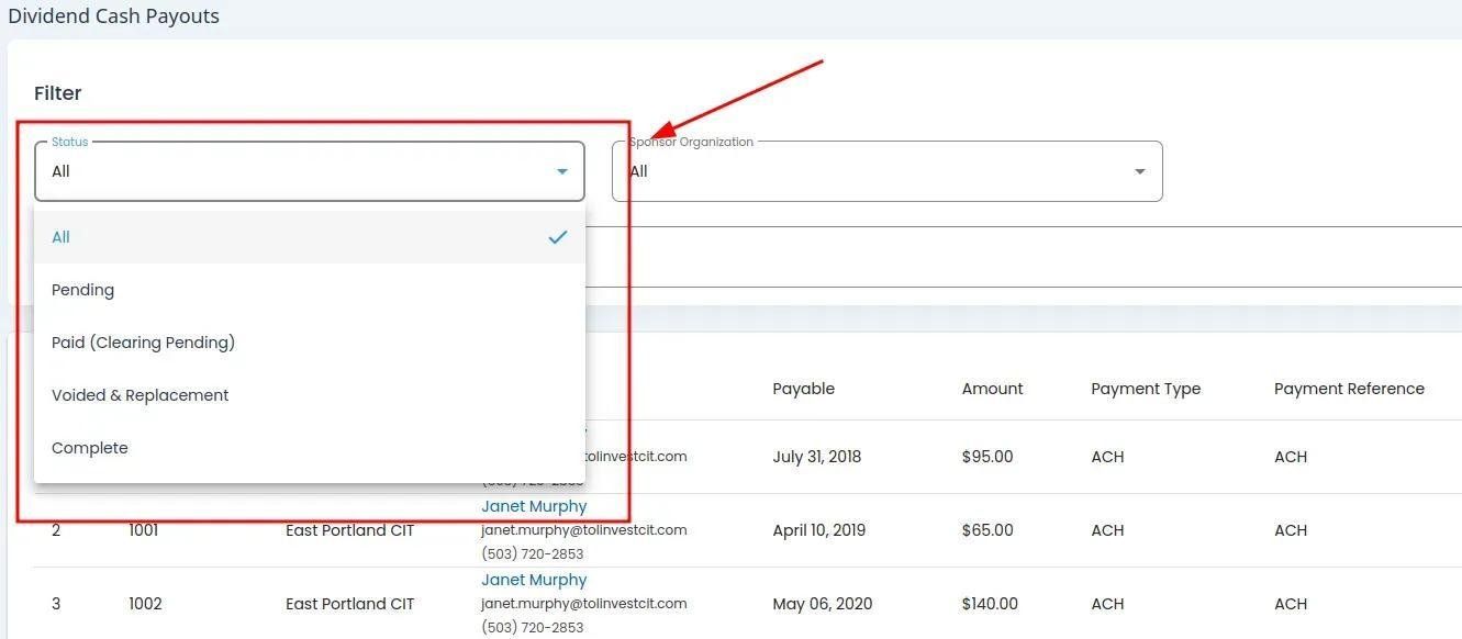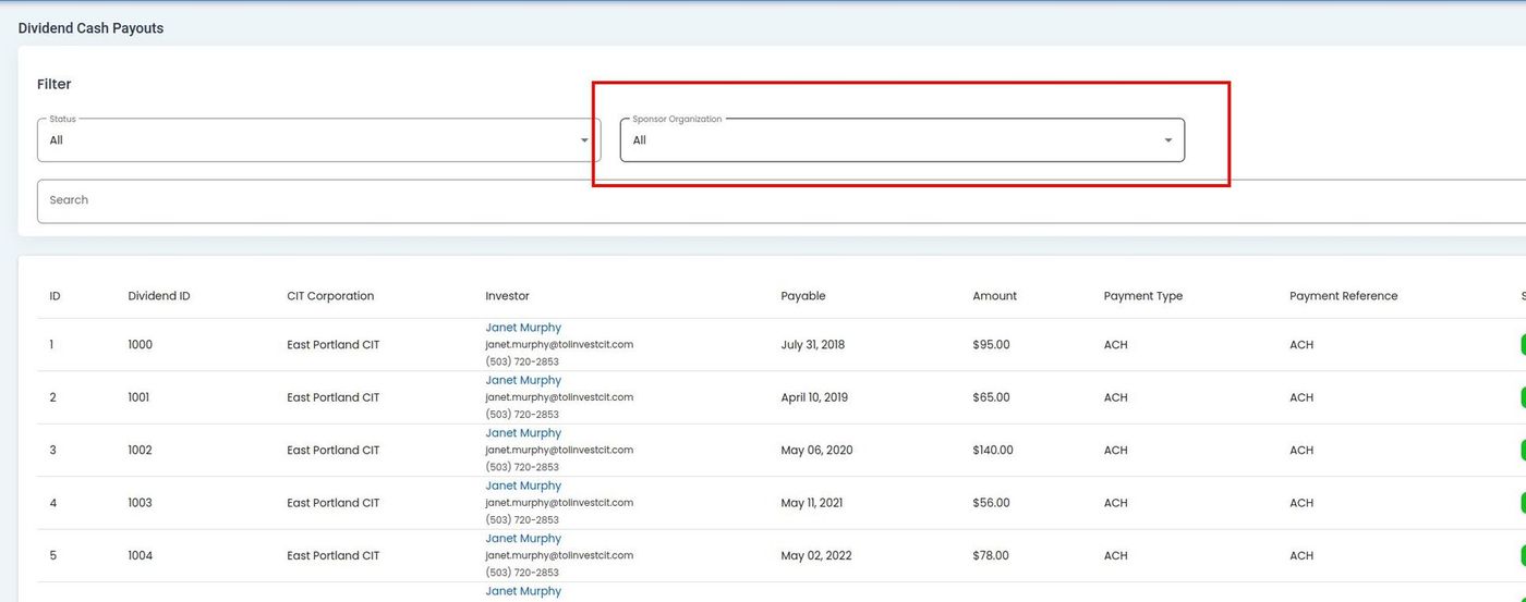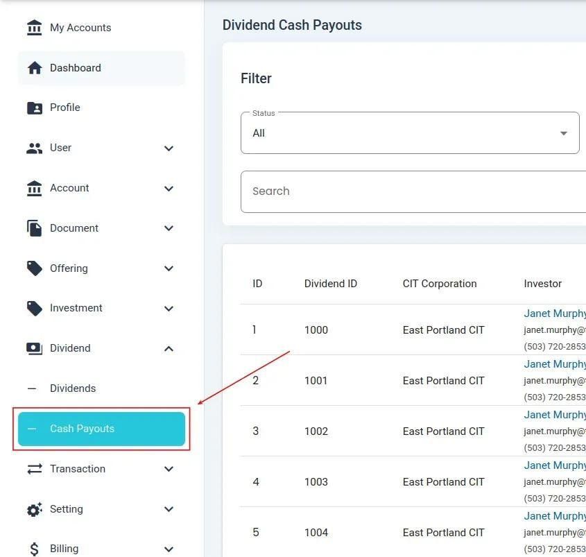 Action: Type in the Name of the Investor you want to see Option: Cash Payouts for.