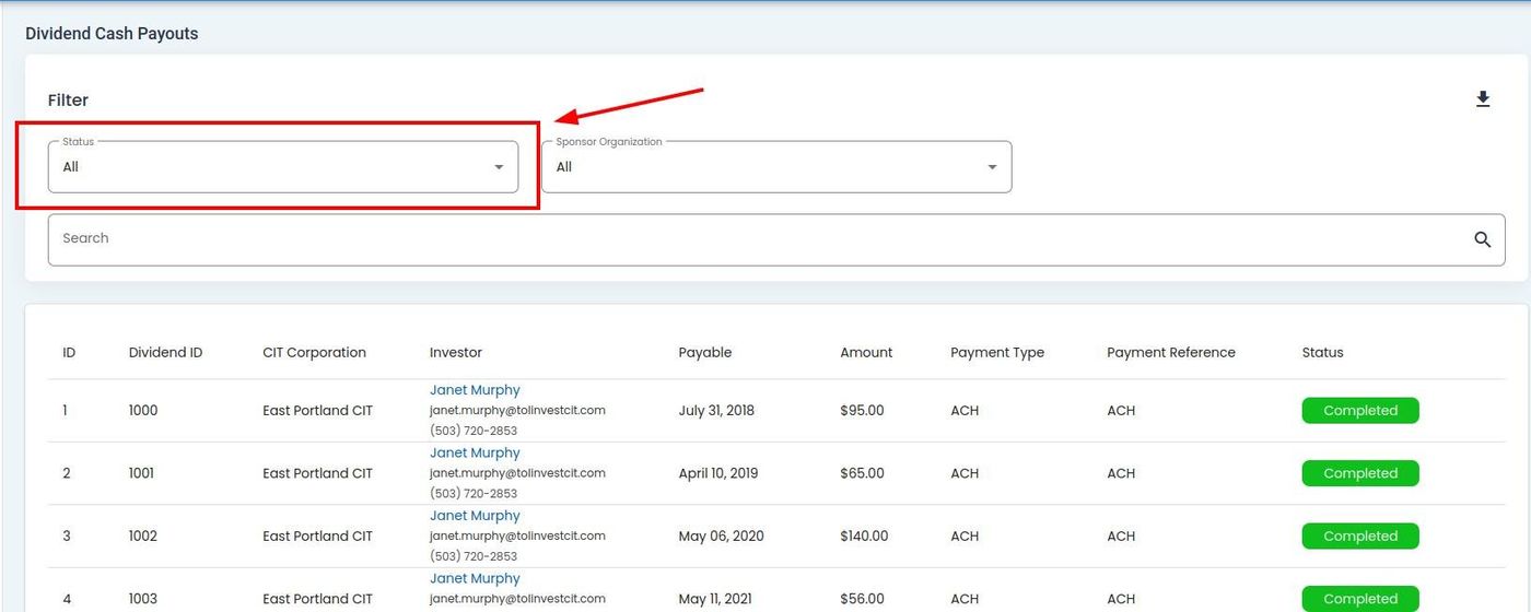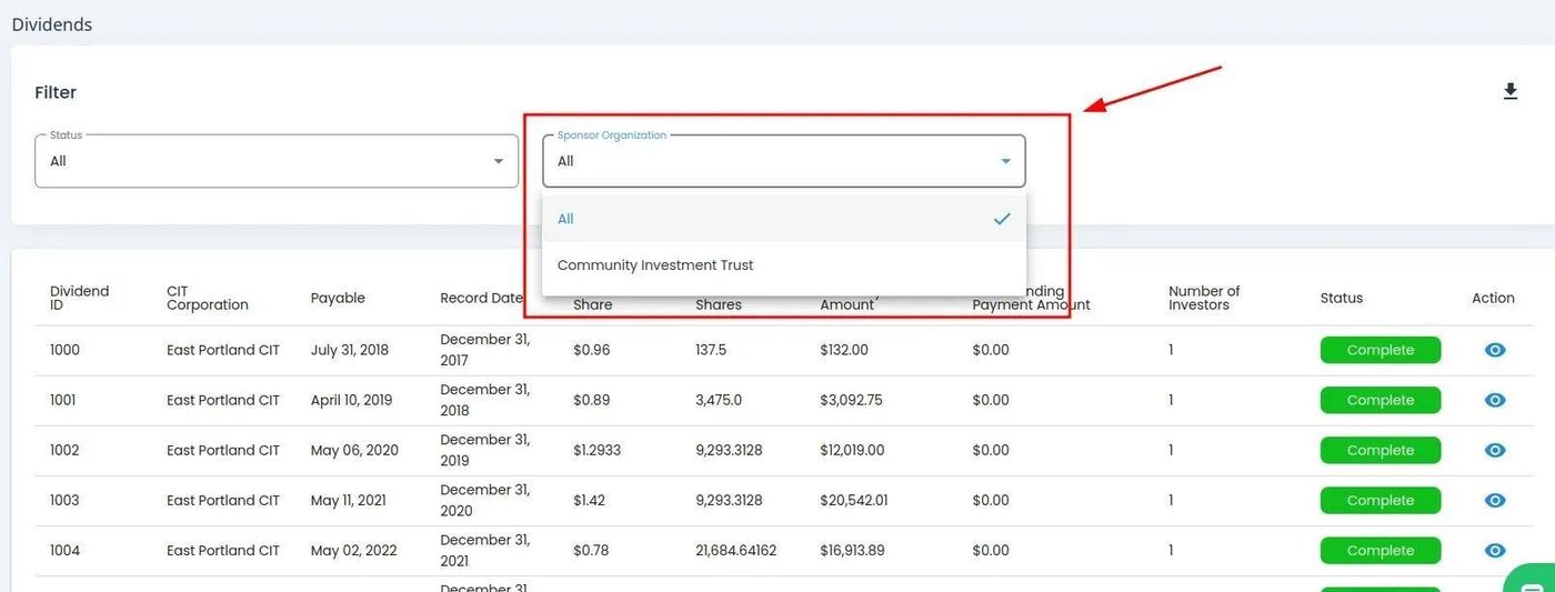 Column: Status: The current status of the dividend (e.g., Complete)