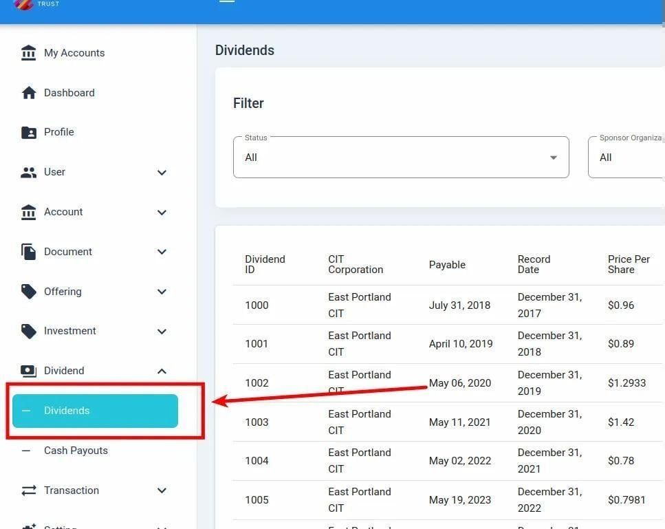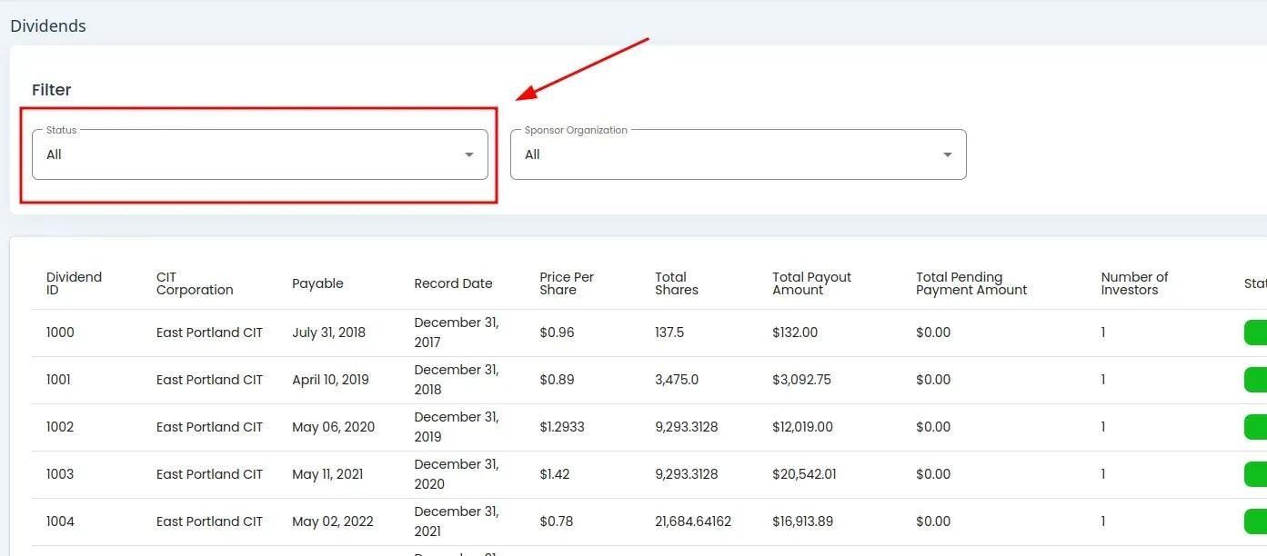 The Table: Dividends List table is what first appears on the homepage of the Section: Dividends section.