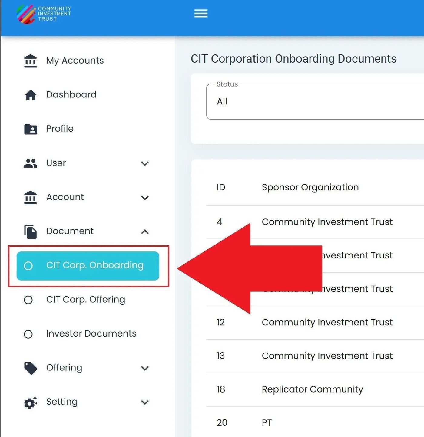 The Section: CIT Corp Onboarding section opens up to the Table: Onboarding Documents table:
