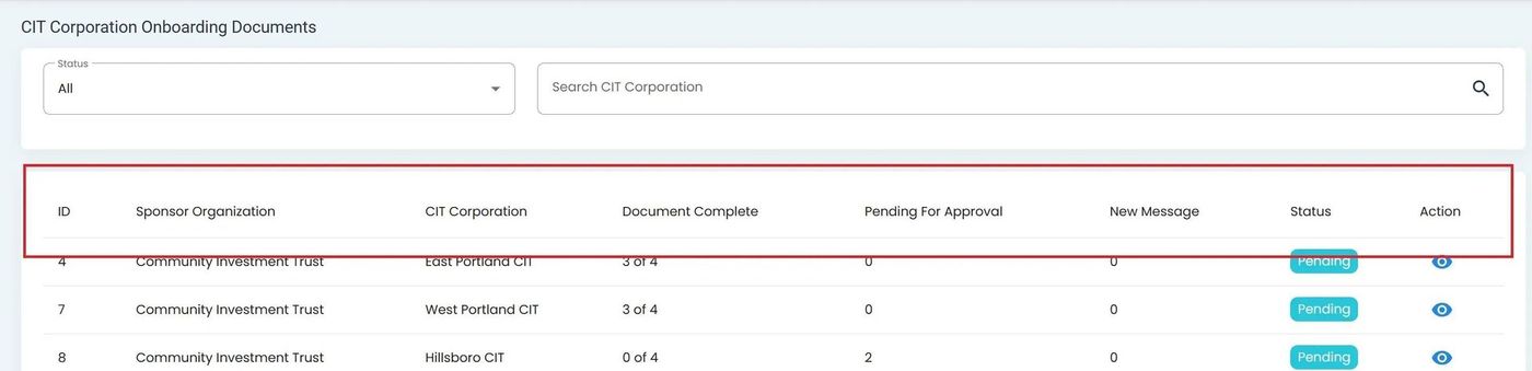 View More Details`: Action to view more details about the documents and where they are at on the onboarding process for the selected CIT Corporation.