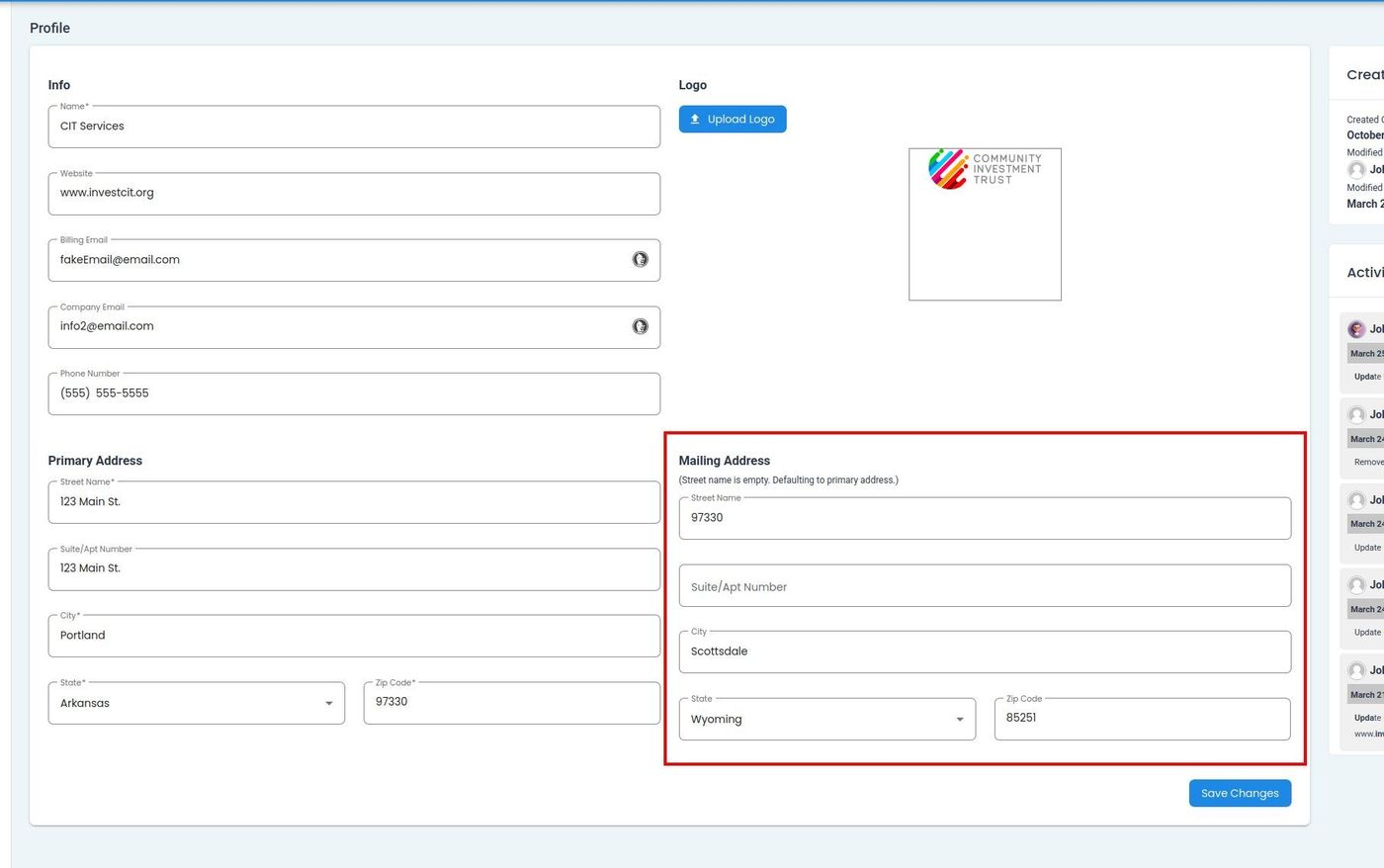 The Section: Mailing Address section allows you to update your company’s mailing address if it’s different from the primary address.
