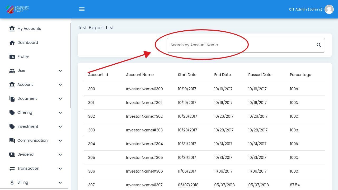 Action: Enter the investor name or account ID in the search field.