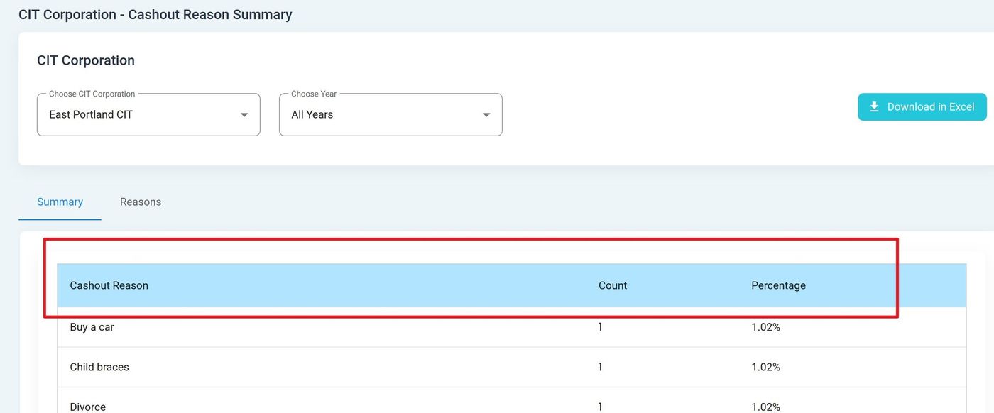 View cashout reason statistics