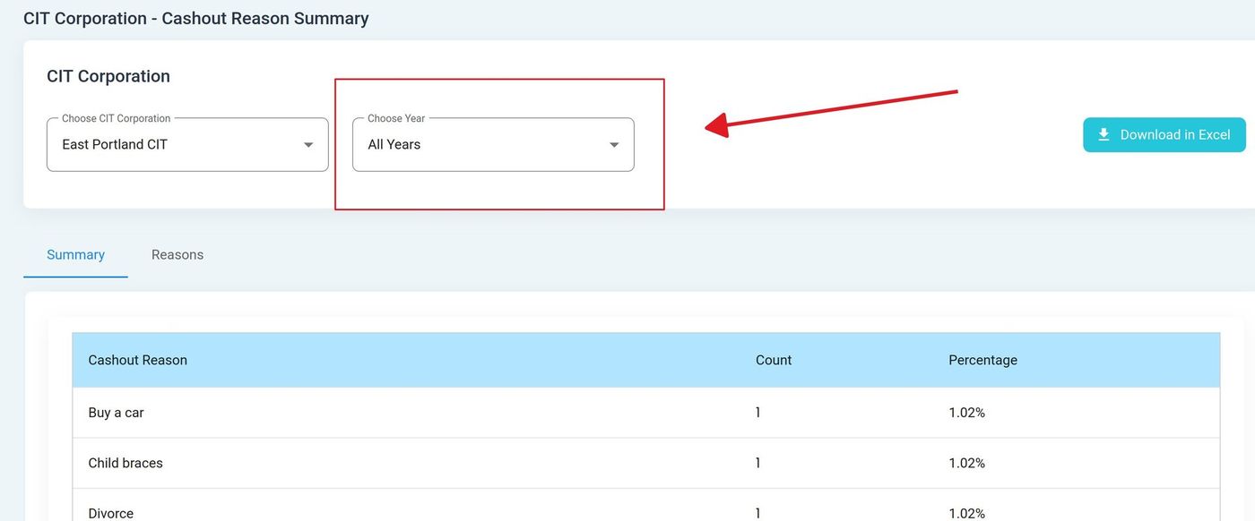 Action: Select a year from the dropdown. You can also select “All Years” to view data across all years: