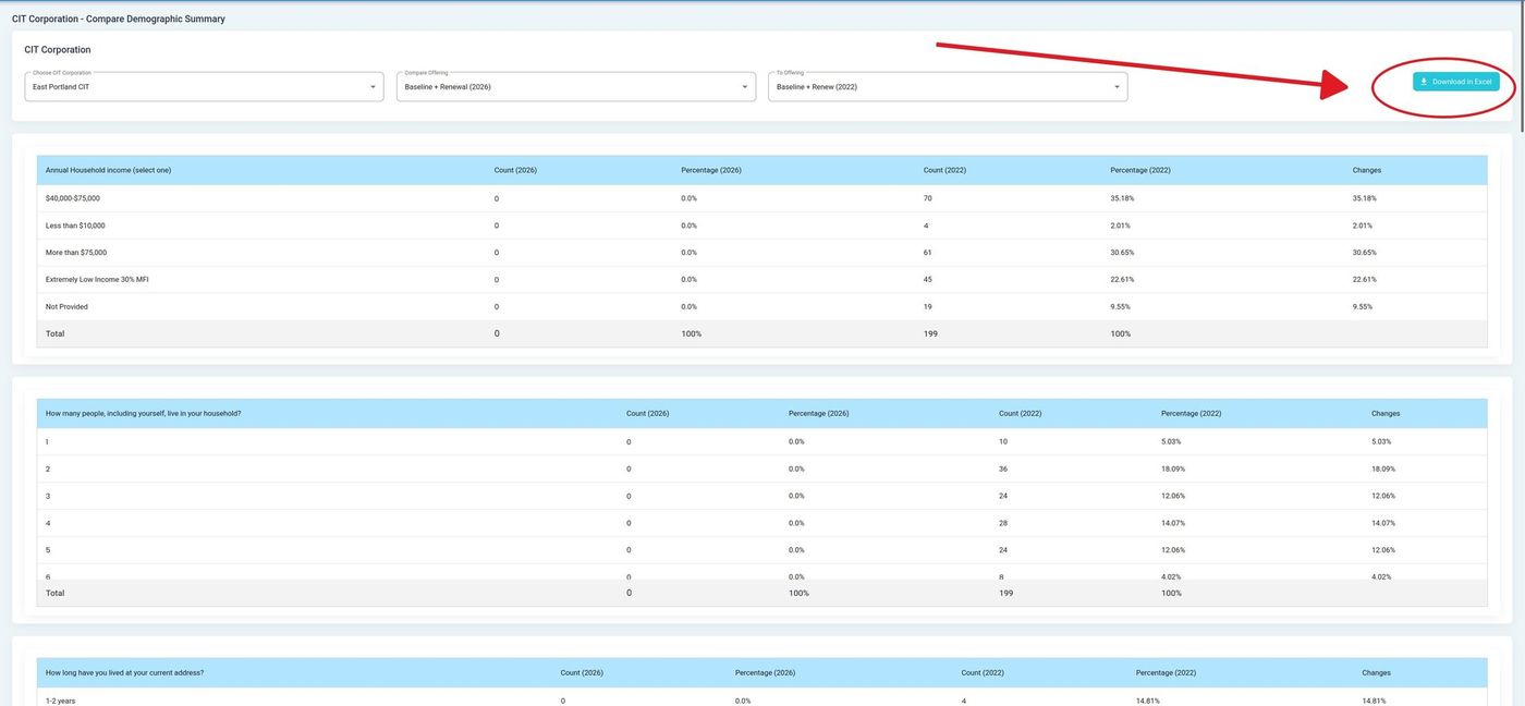 Use the Excel format for data analysis and the PDF format for sharing or printing. The renewal demographic data can be compared with initial demographic data to track changes over time.