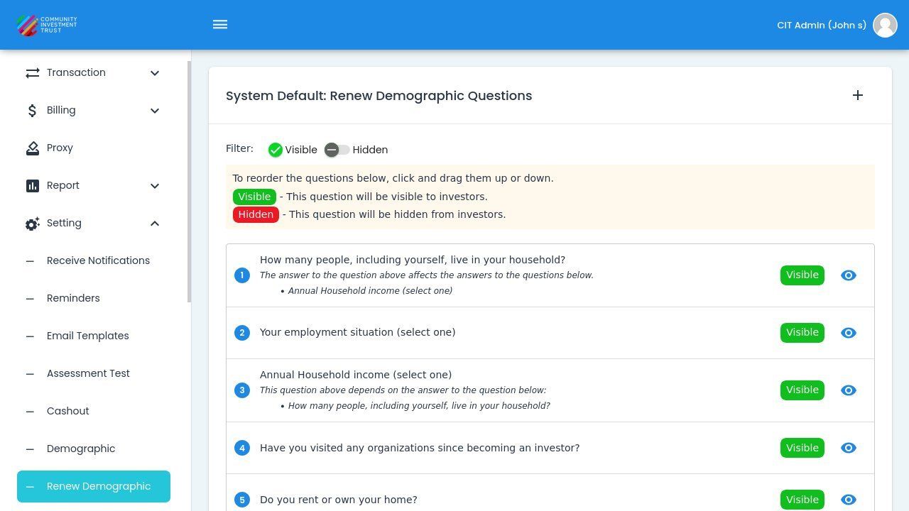 Renew demographic questions are presented to investors periodically to keep their demographic data up to date and ensure continued program eligibility.