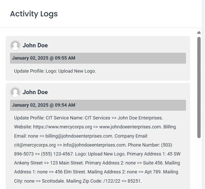 The Activity Logs section contains a list of changes made to the company’s profile.