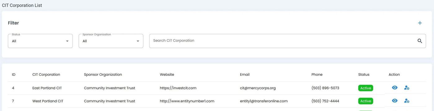 The Section: CIT Corporations section opens up to Table: CIT Corporations List table: