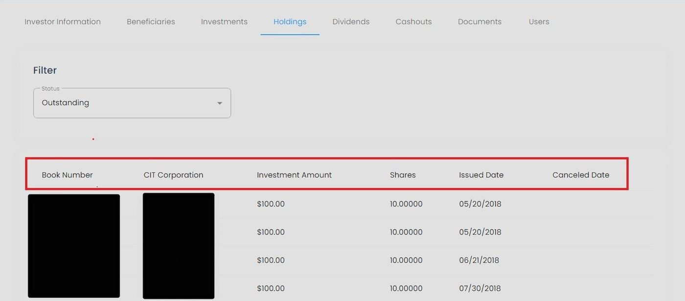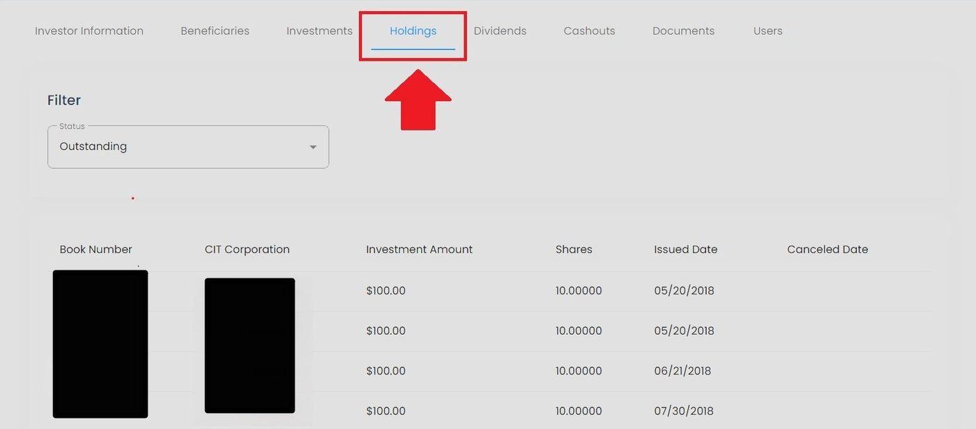 The Tab: Holdings tab provides a comprehensive view of all investment positions and certificates associated with the investor.