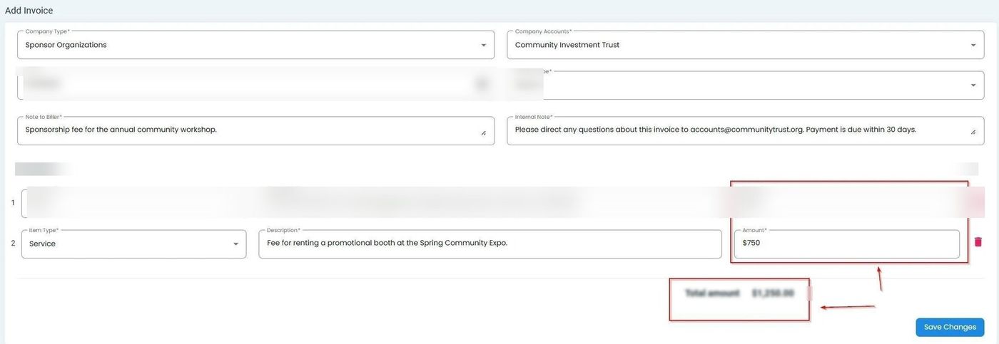 The invoice total automatically recalculates when you add, modify, or remove line items.