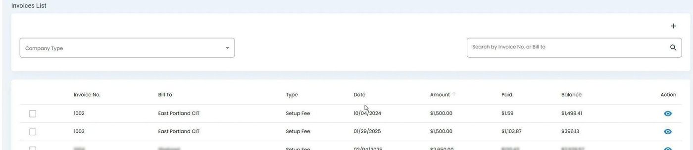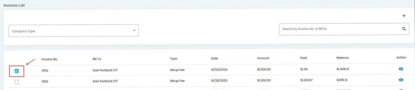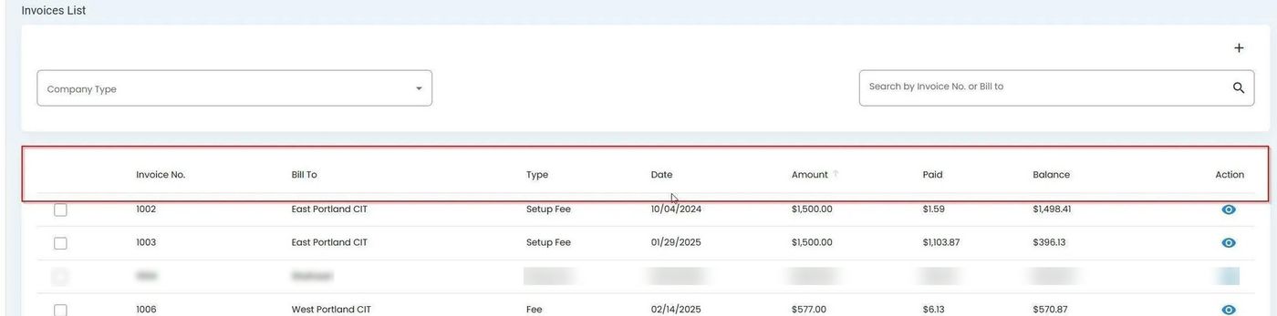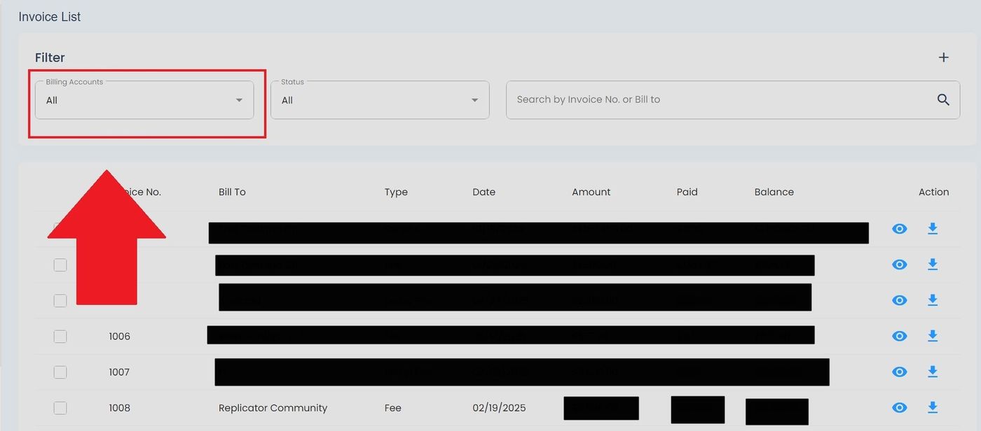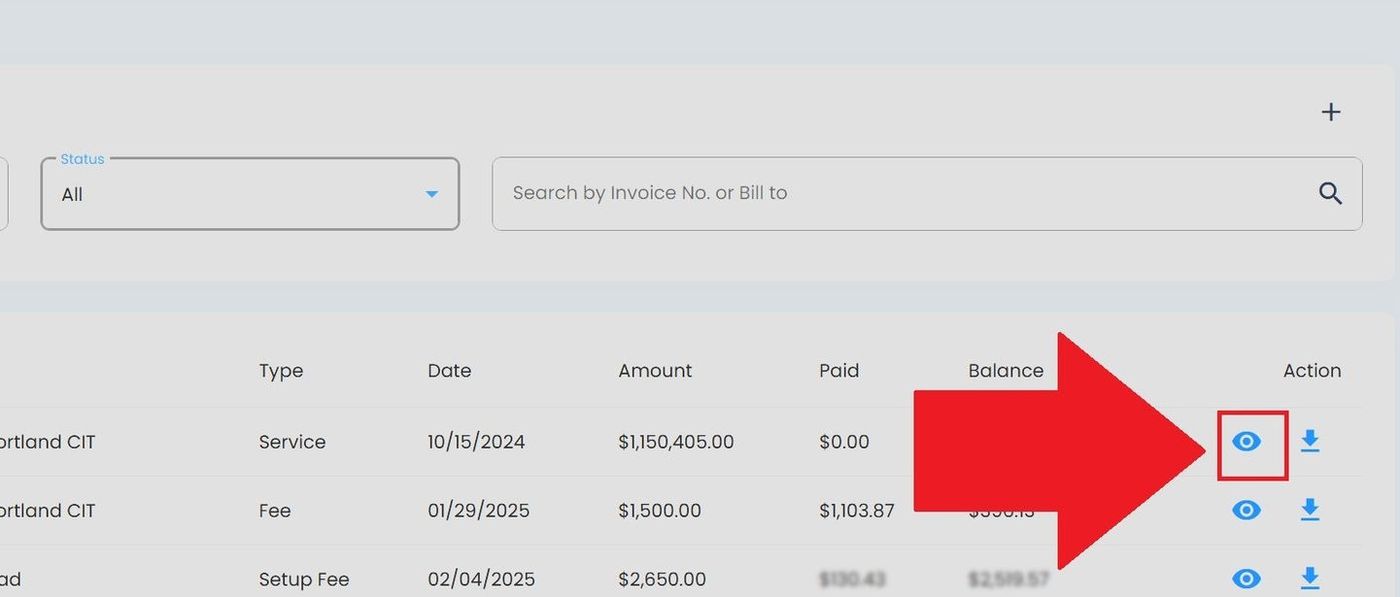 To view the details of a specific invoice, click the Action: View button (eye icon) in the Column: Action column:
