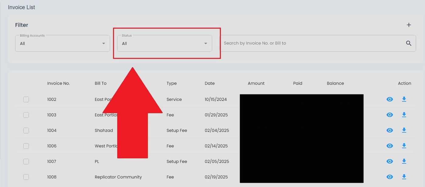 Billing, Invoices, Status Filter Location#