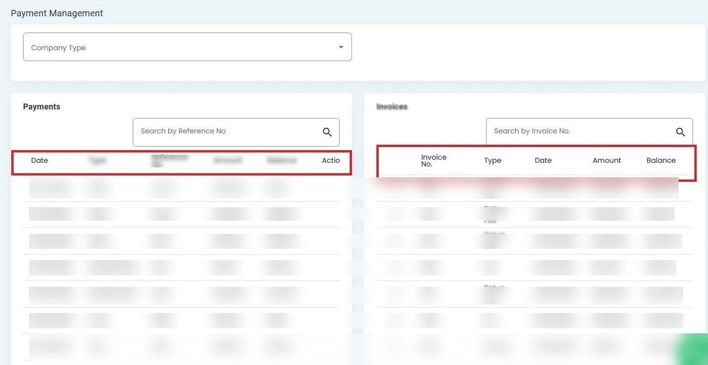 The Table: Invoices table in Payment Management displays outstanding invoices that can receive payments.