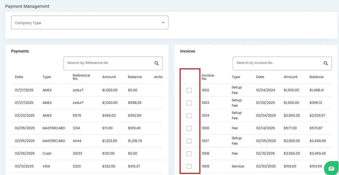 The Table: Invoices table includes a checkbox column for selecting invoices to apply payments: