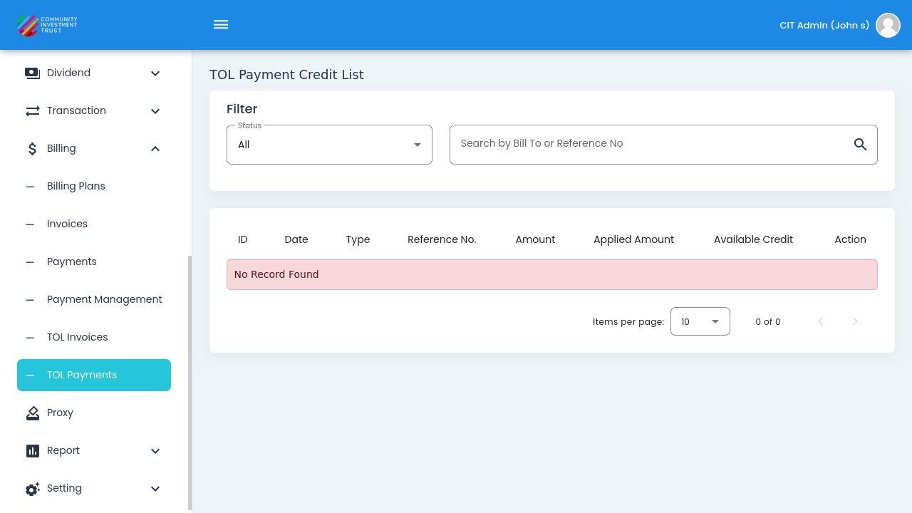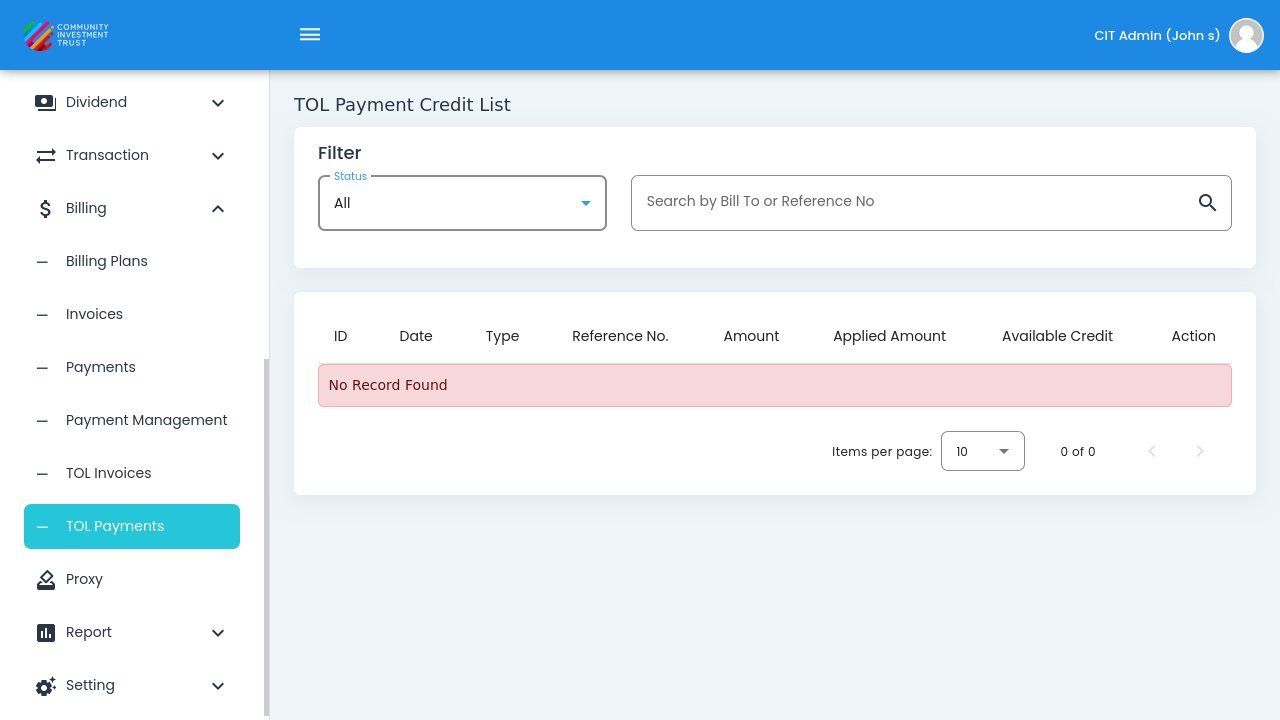 Use the search field to find TOL payment credits by Bill To entity or Reference Number.