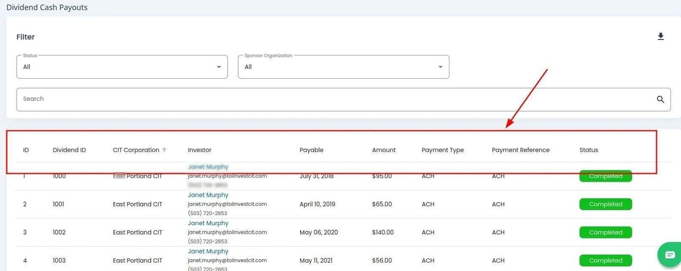 The Section: Cash Payouts section displays all cash distributions and provides comprehensive tracking and management capabilities.