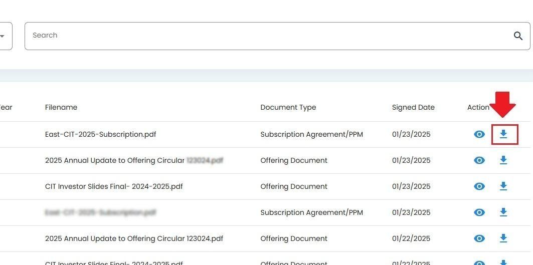 The Table: Investor Documents table allows you to do the following for each listed document: