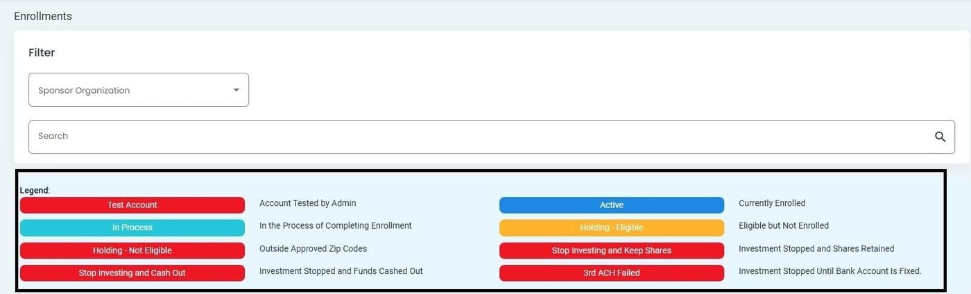 The Table: Enrollments table can display any Option: Investors with any of the following statuses: