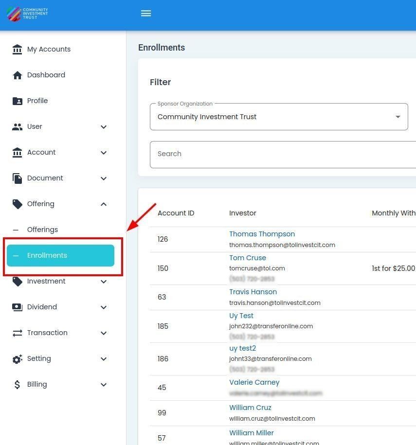 View all investor enrollments in the Enrollments Table
