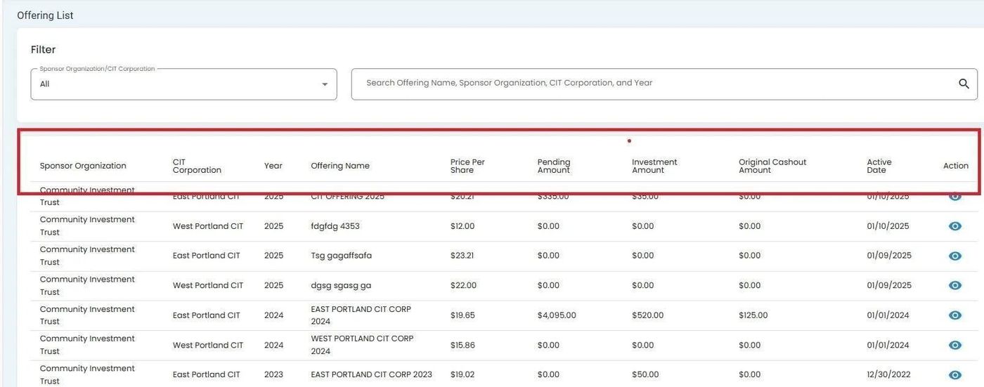 The Table: Offerings List table displays all offerings in the system, organized by Sponsor Organization and CIT Corporation.