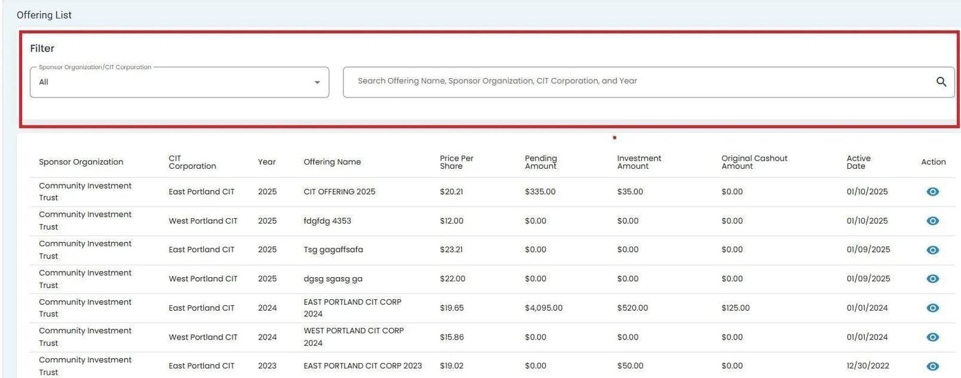 The Table: Offerings List table can be filtered by and .