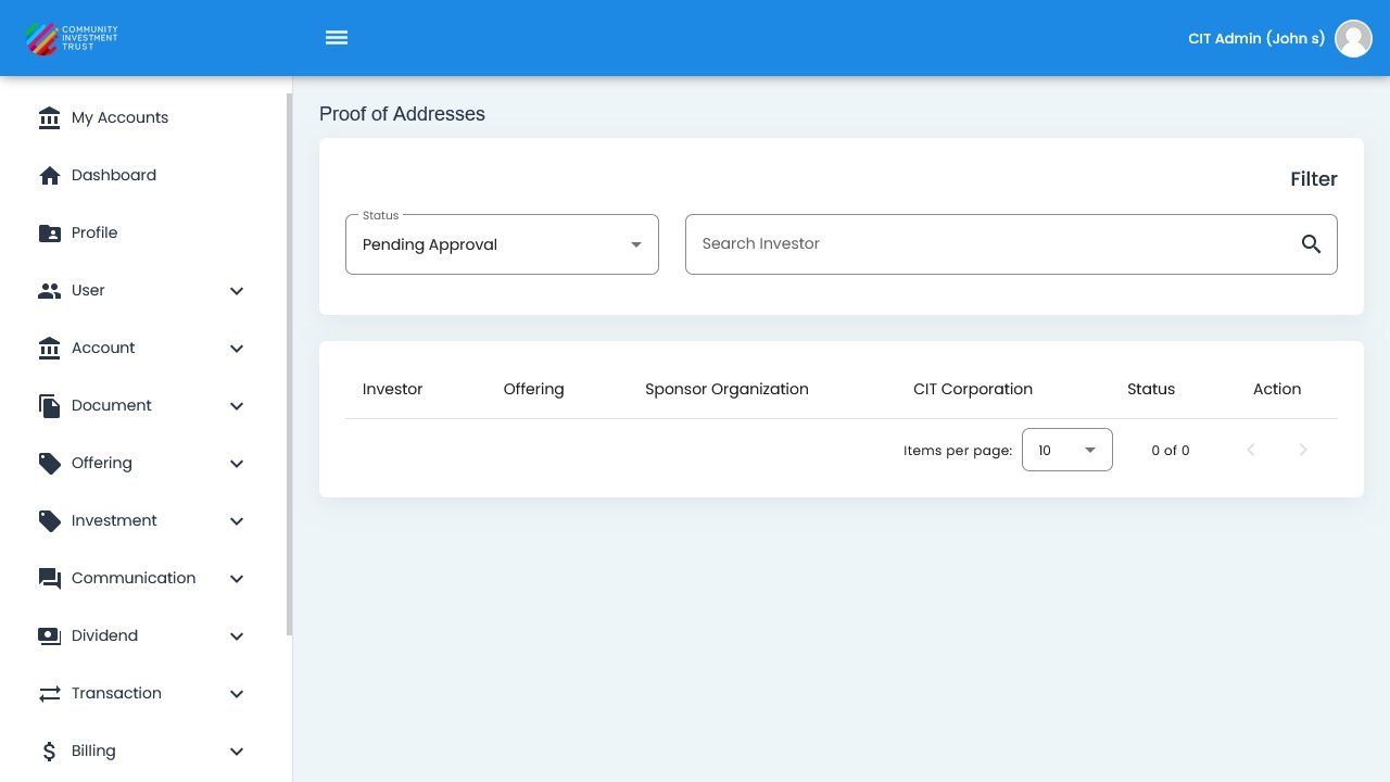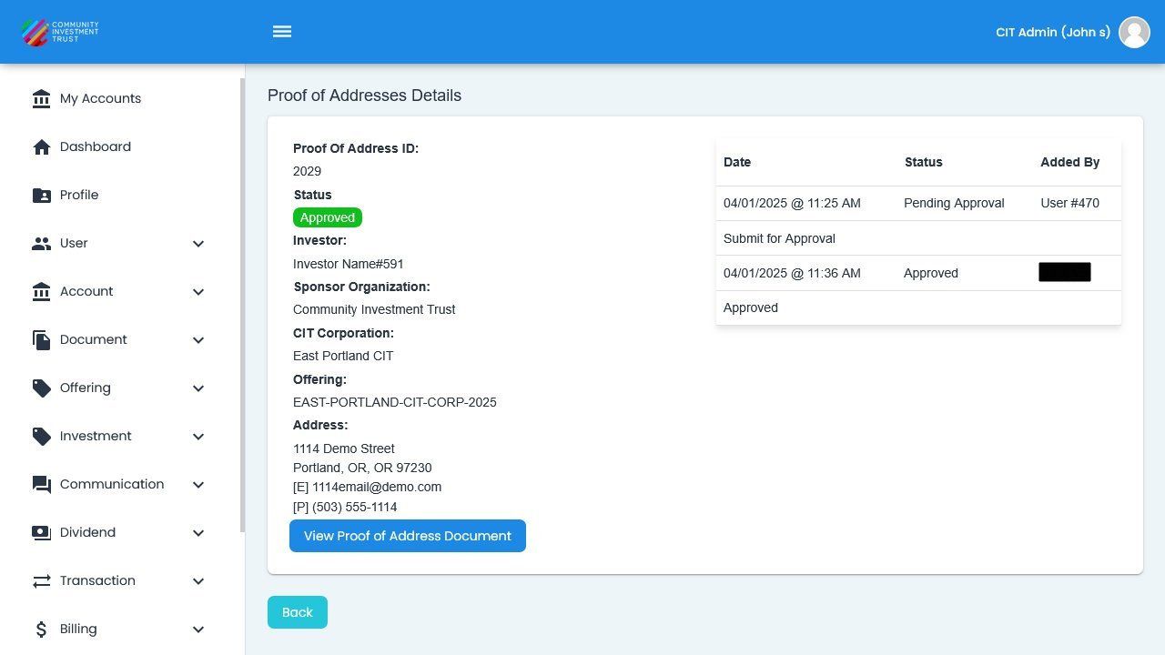 The Action: Manage action allows you to modify proof of address record information, including updating investor details and document status.