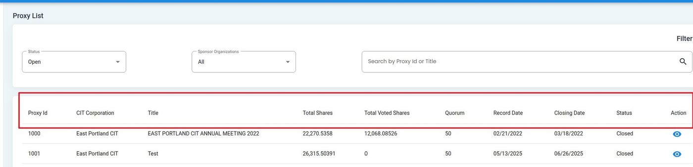 Column: Status - Current status of the proxy (Open/Closed).