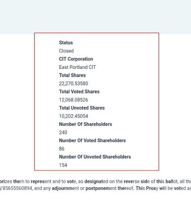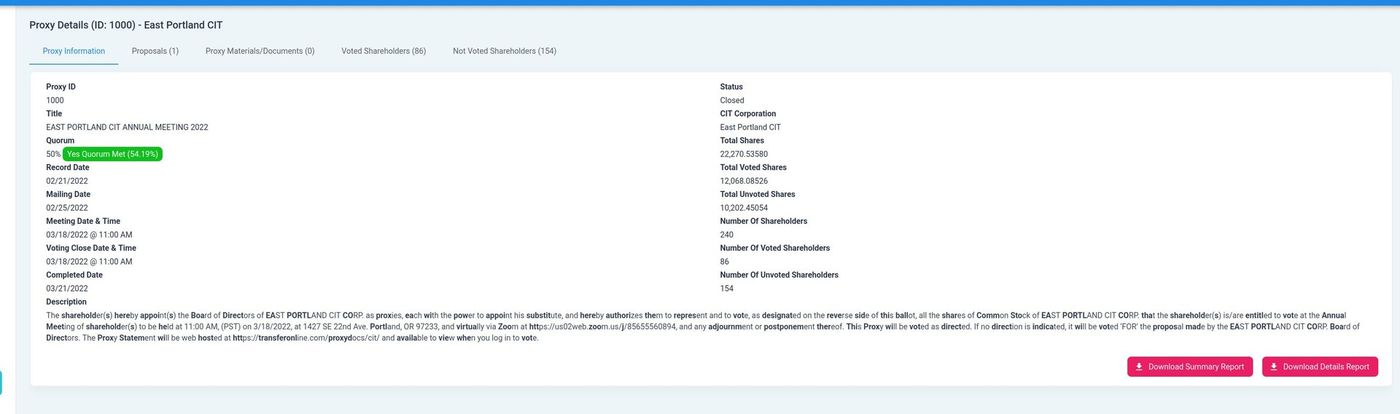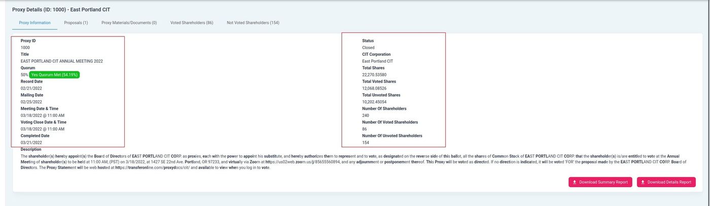 The Tab: Proxy Information tab displays comprehensive details about the proxy voting record, including dates, metrics, and shareholder statistics.