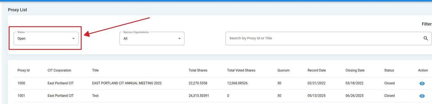 Action: Select a status from the dropdown to filter results.