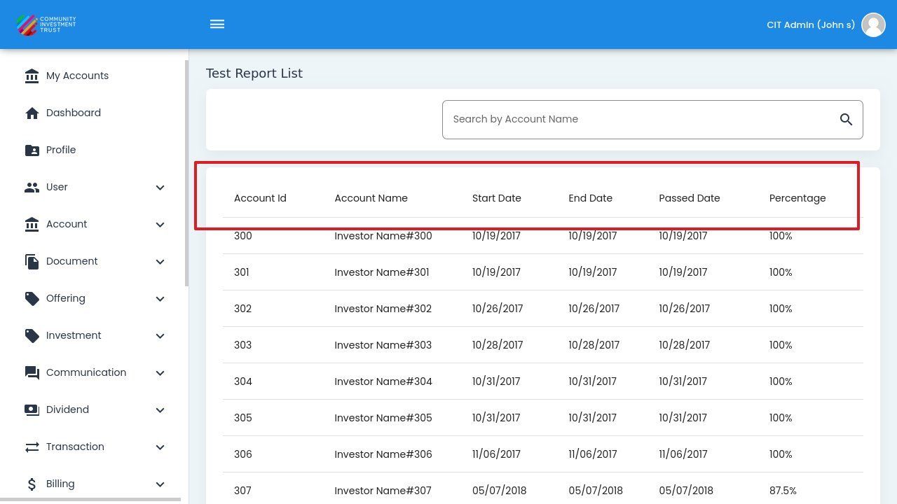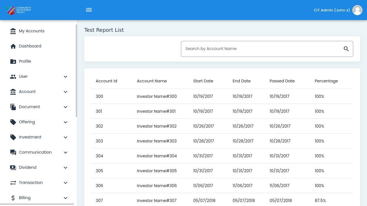 The Assessment Test Reports provide administrators with detailed insights into investor knowledge assessments. This report tracks which investors have completed required assessments, their scores, and pass/fail status.