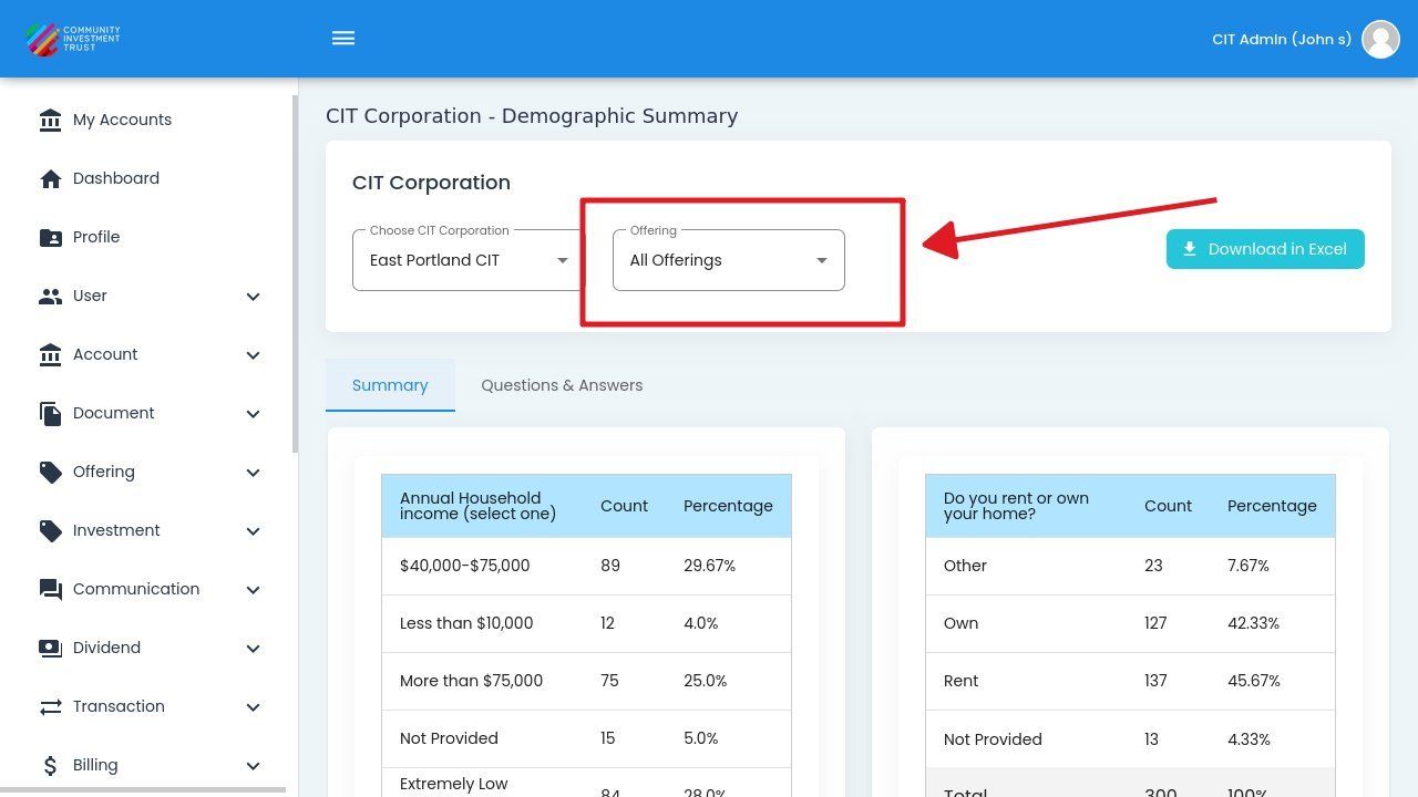 Action: Select an offering from the Item: Choose Offering dropdown to analyze demographic data for that offering.