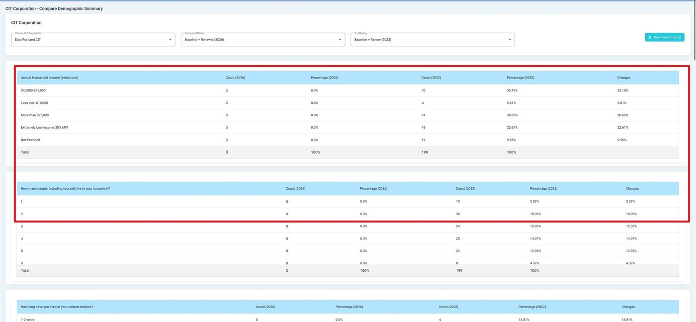 The Section: Compare Demographics Report provides side-by-side comparison of demographic data across offerings, enabling you to analyze how investor demographics differ between investment periods.
