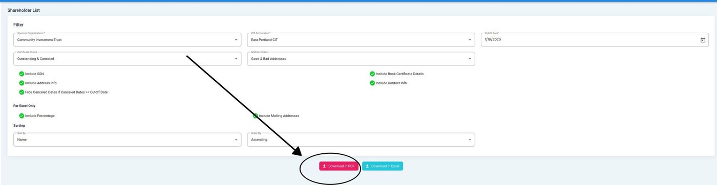 Download the Shareholder List Report in PDF or Excel format after configuring your filter and display settings.