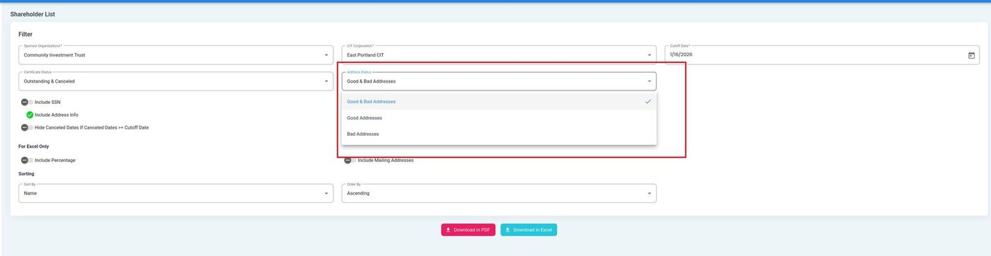 Status: Good & Bad Addresses - Displays all shareholders regardless of address validation status.
