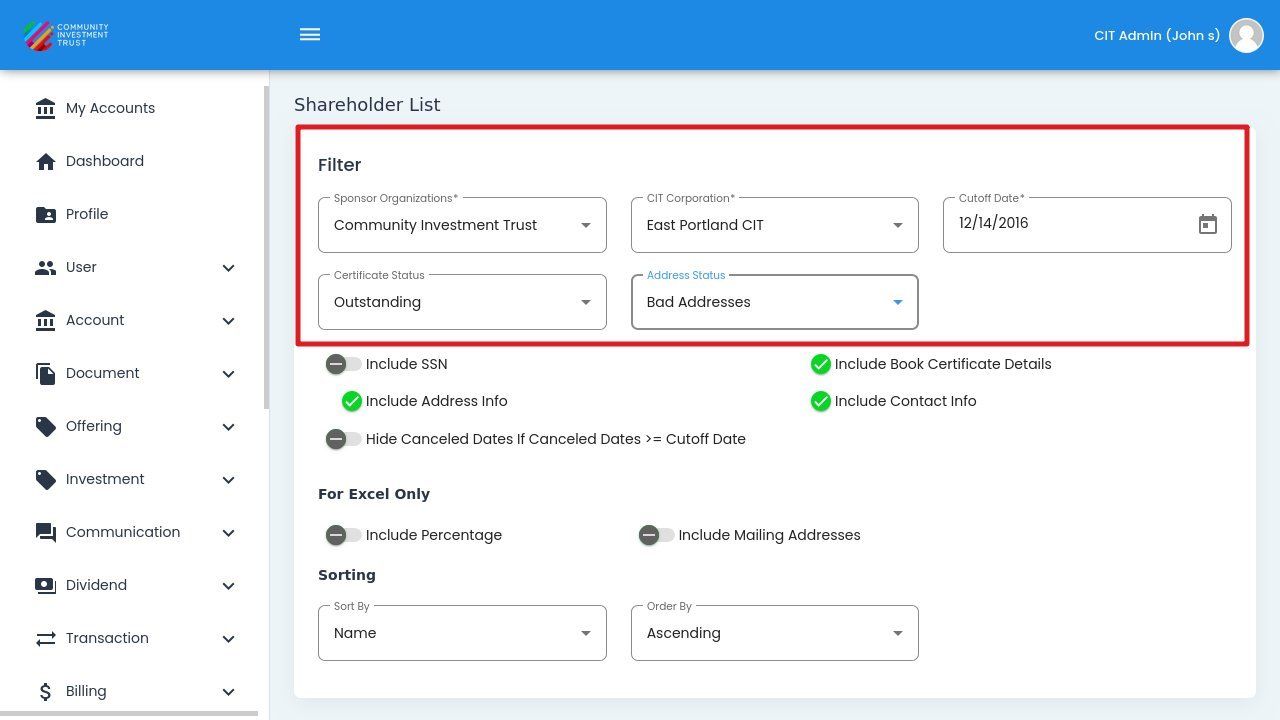 Status: Bad Addresses - Displays only shareholders with invalid or unverified addresses.